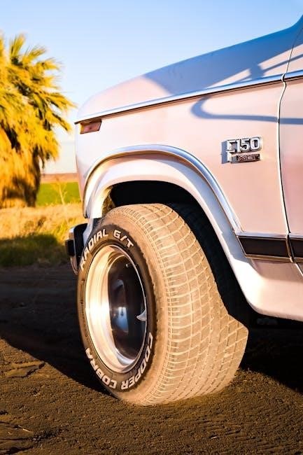 Proper tire pressure is essential for safety, fuel efficiency, and tire longevity. Check tire pressure monthly and before long trips using a reliable pressure gauge. The recommended pressure can be found on the tire information placard on the driver’s doorjamb. Regularly inspect tires for wear, uneven tread, and damage. Ensure valve caps are tightly sealed to prevent air leaks. Rotate tires every 5,000 to 8,000 miles to ensure even wear. Avoid overloading your F-150, as this can strain tires and reduce performance. Proper tire care enhances handling, safety, and overall driving experience.